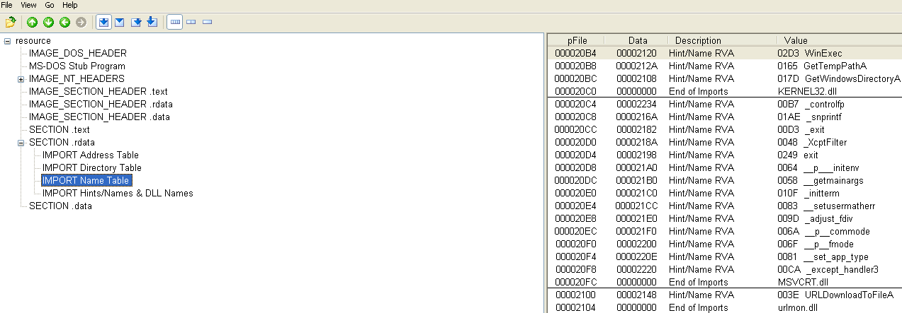 Looking at IMPORT table from the .rdata section for the executable shows that functions are imported from msvcrt.dll and kernel32.dll. The Visual C-runtime (msvcrt.dll) functions all look pretty standard, but there are some functions from kernel32.dll which show file manipulation functions: