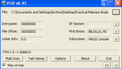 Analyzing this sample with PEiD shows that it is packed using FSG: