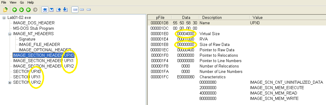 Instead of the usual names like .text, .data, etc., sections have been renamed to UPX0, UPX1, and UPX2, indicating that this sample was packed using UPX. Sections with a virtual size much larger than the raw data size also indicate packing.