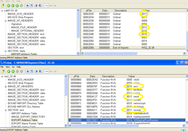 However, there is something interesting in the .rdata IMPORT table from the DLL file. Ten functions are imported from WS2_32.dll, but they are imported by ordinal instead of name, which disguises their purpose. Opening C:\Windows\system32\ws2_32.dll in PEView and looking at the EXPORT table in the .text section allows a cross-reference of the ordinal values and their name. This DLL includes functions for network communication and a few can be seen here: