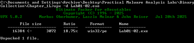 To unpack this file, I was able to download UPX from GitHub and fortunately it still works on XP!