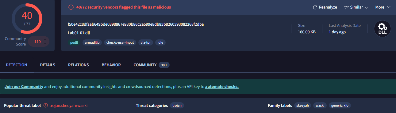 The DLL was flagged by 40/72: