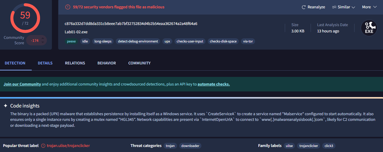 When I reached Chapter 5 I was forced to install a Windows 10 VM to use IDA Pro, so I was able to come back here and upload these samples to Virus Total. The executable was flagged as malicious by 57/72 vendors: