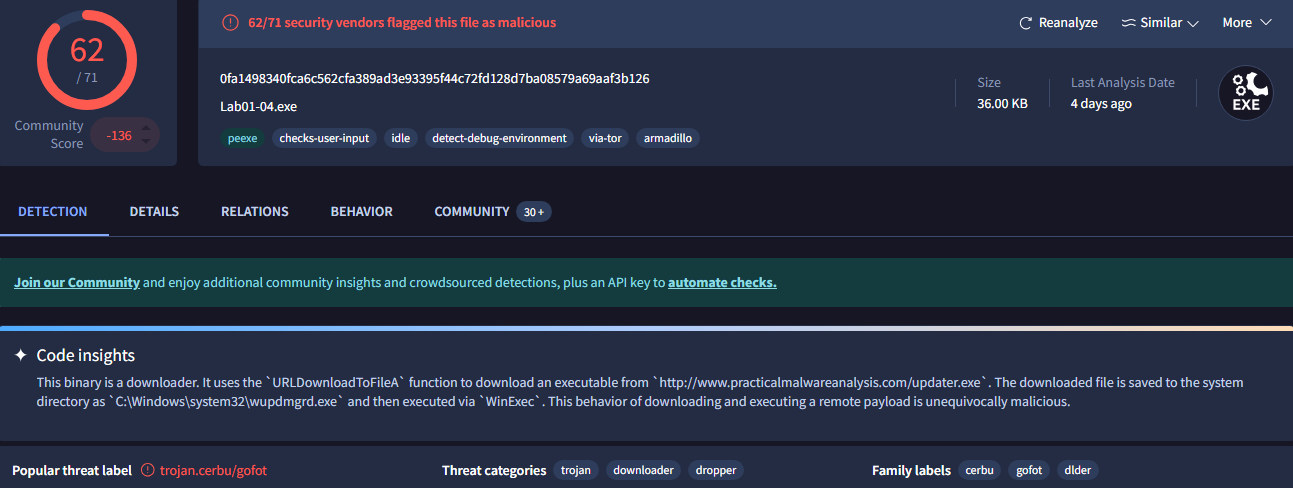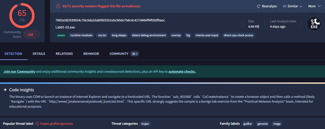 And that's the end of the Chapter 1 labs! This was a great overview of PE files and their structure, which was something I had read about in my Malware Analysis course, but getting this hands-on practice really improved my understanding. I am actually happy that I was not able to upload to VirusTotal the first time around because it gives a very detailed description of how each sample works, which would have undermined the learning experience. I'm assuming VirusTotal did not have this functionality at the time PMA was written.