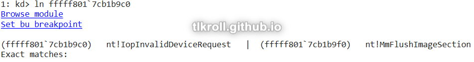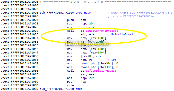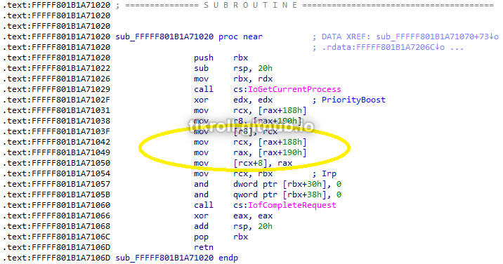The ln command was not useful for the other functions because they are defined within the object and have no associated labels. The best option at this point is to manually load the driver in IDA with the same base address as the DriverStart address 0xfffff801b1a70000 obtained from the dt nt!_DRIVER_OBJECT call earlier. The only call within the first function at 0xfffff801b1a71000 is to IofCompleteRequest, which runs any routine specified by the Irp parameter upon request completion: