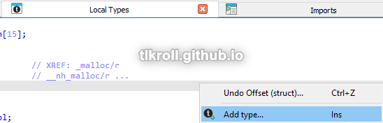 It isn't obvious what functions are being called from a COM object just by looking at the disassembly. One method for finding these functions involves locating the IWebBrowser2 vtable in Microsoft's exdisp.h header file and navigating to the calculated offset, which I documented when analyzing this sample. Another method is adding the vtable as a structure in IDA. To add the IWebBrowser2 vtable to IDA so that it will show the parameter names, first go to the Local Types tab, right click, and click on Add type...:
