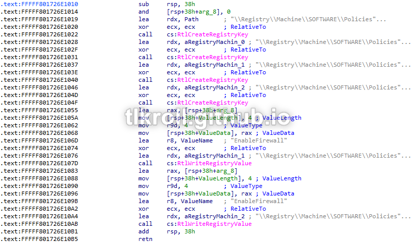 Now we're getting somewhere! There are a series of calls creating registry keys and writing values. Checking the values that are written, it writes 0 to the values for the DomainProfile, StandardProfile, and base WindowsFirewall keys, disabling the firewall entirely: