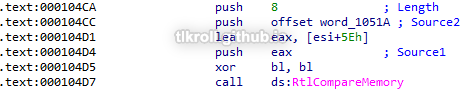 Looking at the raw hex, those characters are Mlwx. This routine checks to see if the file name being returned by NtQueryDirectoryFile matches the Mlwx486.sys driver that was written to C:\Windows\System32:
