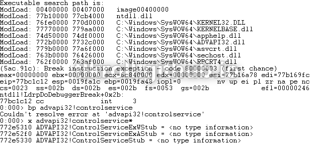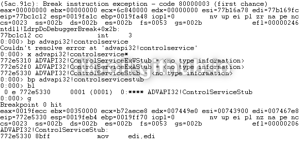 Since there is nothing obvious happening within the main code of the driver, let's see what happens when ControlService issues the command to stop. This will require two instances of WinDbg; one in user-mode inside the VM to debug the executable and a second outside the VM to debug the kernel-mode execution of the driver. Trying to set a breakpoint on ControlService resulted in a "couldn't resolve" error because a stub function is being called instead of a call straight to ADVAPI32. The actual name can be discovered using the x command and a wildcard: