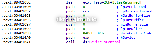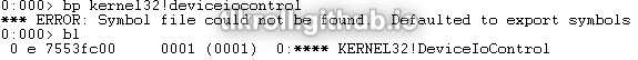 Fortunately, WinDbg was a little more cooperative with this sample and I was able to set a breakpoint on DeviceIoControl: