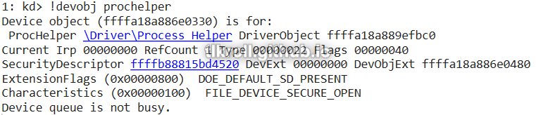But remember that a device named ProcHelper was created with CreateFileA, the handle to which was used in the DeviceIoControl call. Here, the !devobj command can be used instead: