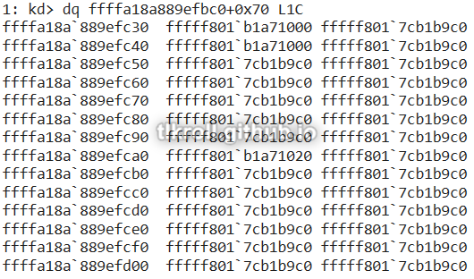 Using the dq command to display data from memory in quad-word form (since this is the 64-bit driver) along with object base address plus the offset to MajorFunction returns a list of function addresses (L1C returns 0x1C results):
