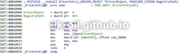 Looking at the driver in IDA, there is also nothing suspicious going on in DriverEntry: