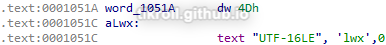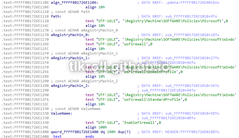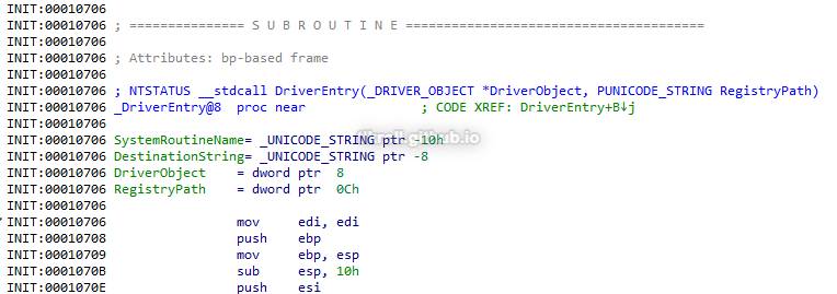 Taking a closer look at the driver embedded in the resource section of the executable, it begins by initializing a unicode string. I needed to look at IDA's hex view to see the complete value: