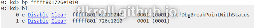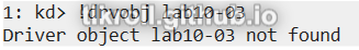 After hitting the user-mode breakpoint, the second instance of WinDbg can be started. First, execution must be broken and then the driver object can be found using the !drvobj command: