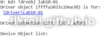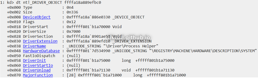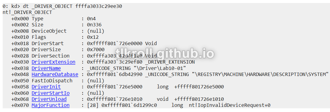 Now that the memory location of the object is known, the details can be viewed with dt _DRIVER_OBJECT:
