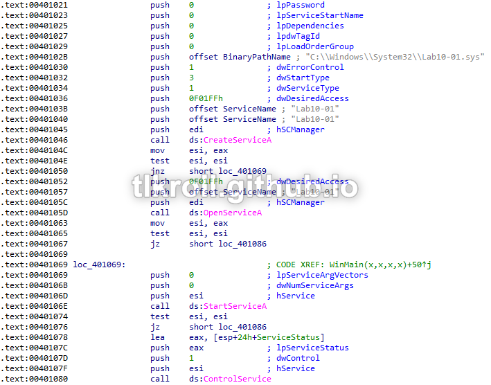 This sample includes an executable and a driver. Looking at the executable in IDA doesn't reveal much. It uses the driver to create a service and then start it. Next, ControlService is called with 1 as the dwService parameter, which stops the service: