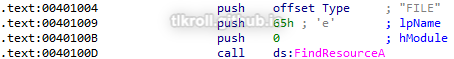 The first call made in this sample is to FindResourceA with 0 as the hModule parameter, which searches the resources section of the current process, and FILE as the lpType parameter, indicating there is a file embedded within the resource section of this binary:
