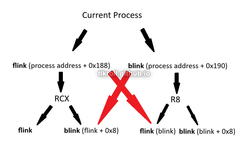 It's difficult to understand this process without visualizing it. Each process has its own flink and blink. The process ahead of the current process holds a pointer to the current process in its blink. The process behind the current process holds a pointer to the current process in its flink. The red arrows in this graphic try to illustrate where the overwrites are occurring:
