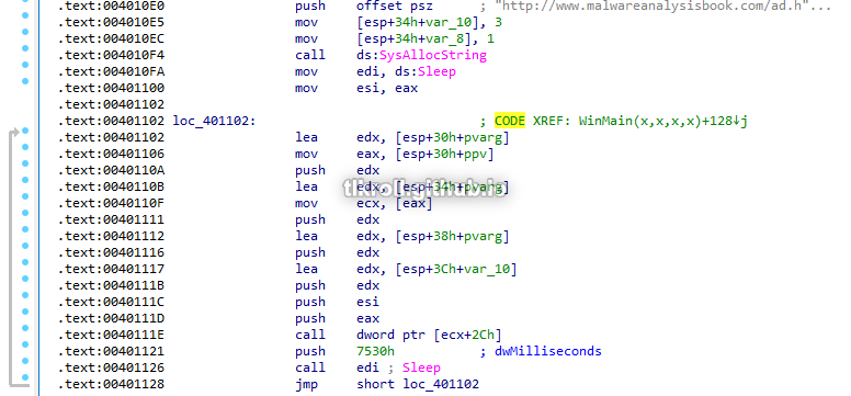 Finally, the string http://www.malwareanalysisbook.com/ad.html is initialized and passed as an argument to the function at offset 0x2C in the IWebBrowser2 interface, followed by Sleep being called for 30 seconds. These calls are inside a loop with no exit: