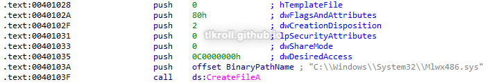 Back to the executable; after finding the resource, it is then loaded with LoadResource and written to C:\Windows\System32 as a file named Mlwx486.sys:
