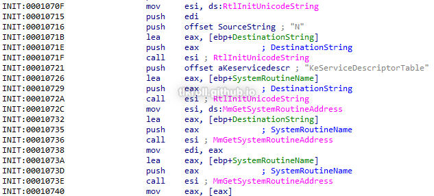 Next, MmGetSystemRoutineAddress is called twice; once with NtQueryDirectoryFile and again with KeServiceDescriptorTable:
