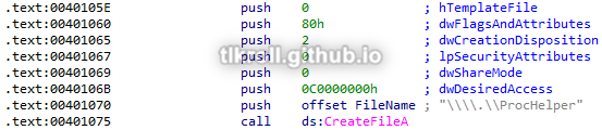 Next, it uses CreateFileA to create a device named \\.\ProcHelper: