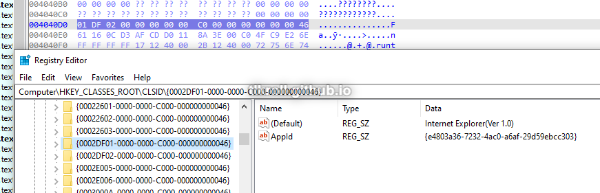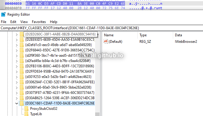The riid parameter points to the IWebBrowser2 interface. These values are a bit tricky to find in the registry because the leading 4 bytes are used for the first section and the endianness is swapped: