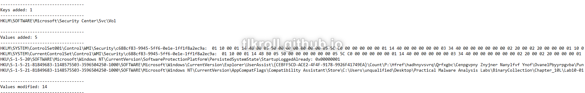 There are no observable changes to the registry in procmon. At first I thought that maybe something had gone wrong because I am using Windows 10 and the updated Windows 7 malicious driver, but there are registry changes visible using RegShot: