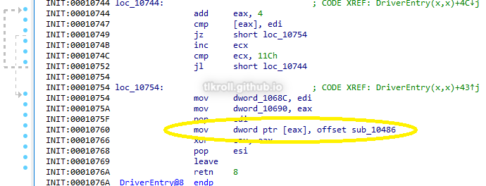 Setting a breakpoint on that function does not yield any results before crashing, so this function is never reached. This may be due to the fact that this sample crashes before completing requests on 64-bit systems, but this function still does not appear to do anything malicious. However the opportunity exists to pass a malicious function pointer to IofCompleteRequest and this knowledge may be useful in the future.