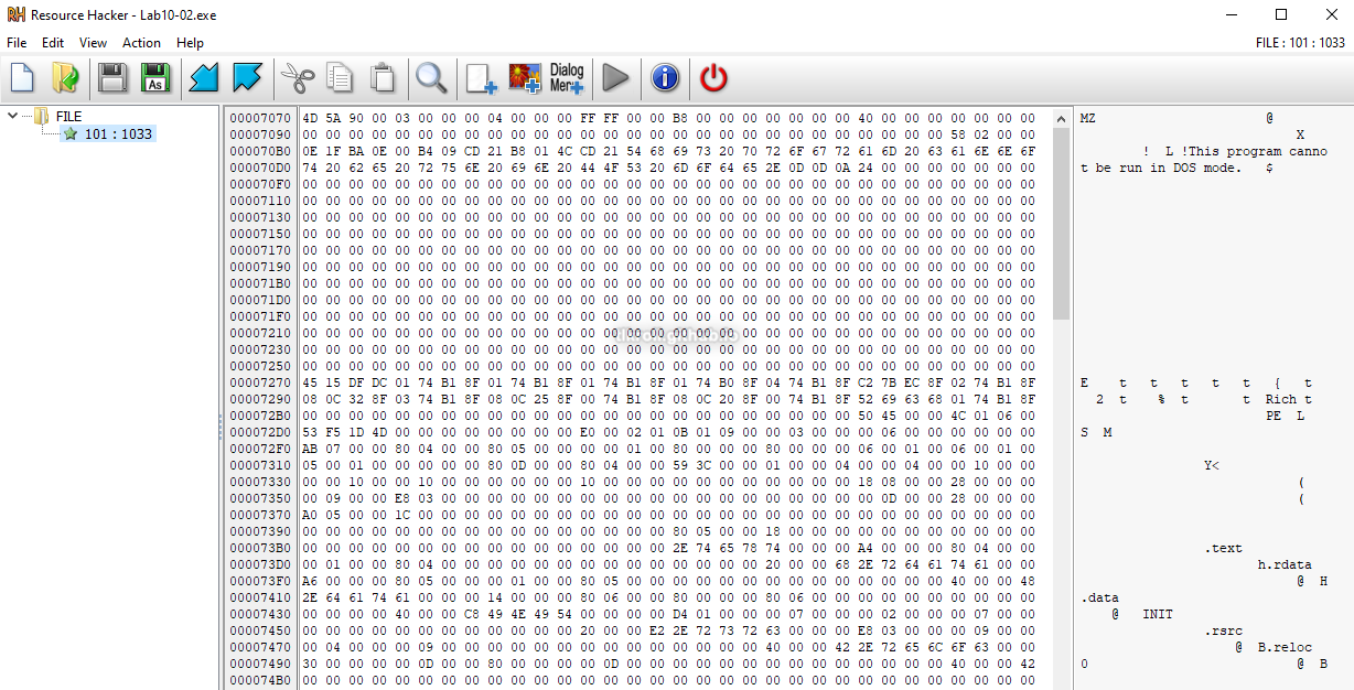 When opened in Resource Hacker, evidence of a PE header can be seen with a quick glance at the hex editor:
