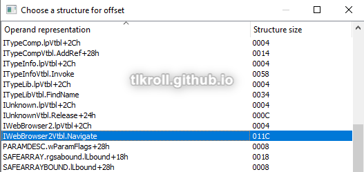 Finally, select the call instruction with the unknown offset and press T. Sorting by the name of the structure and scrolling down to IWebBrowser2, the offset and function name can be seen: